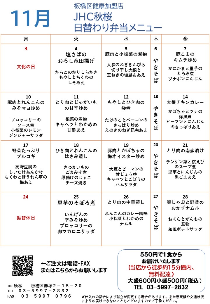 令和7年11月のメニュー表