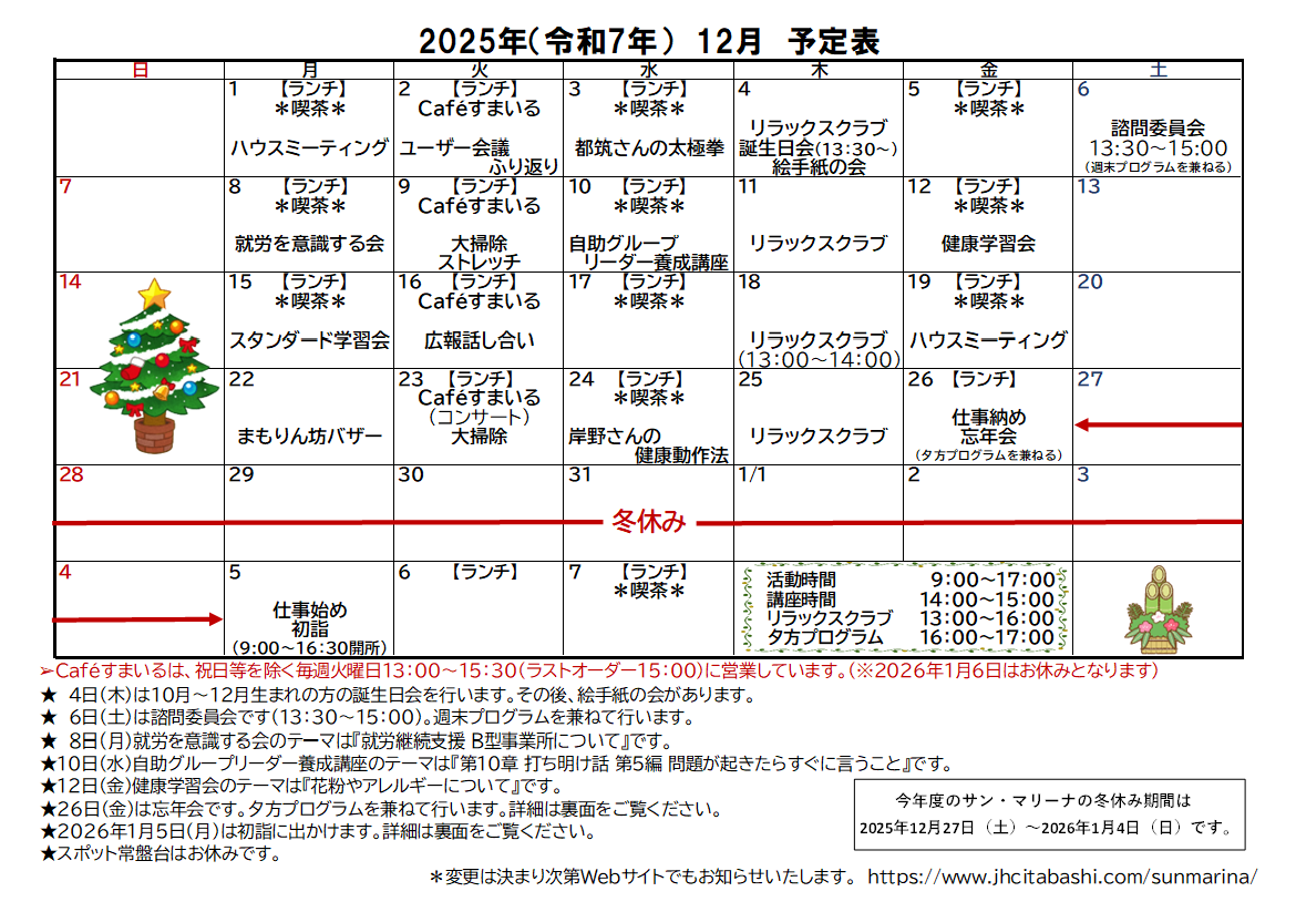 遅くなりましたが、令和7年12月の予定表をお知らせいたします。