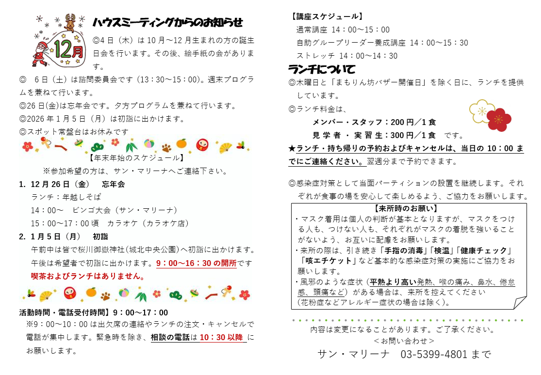 2025年12月27日(土)~2026年1月4日(日)はサン・マリーナの冬休み期間となります。