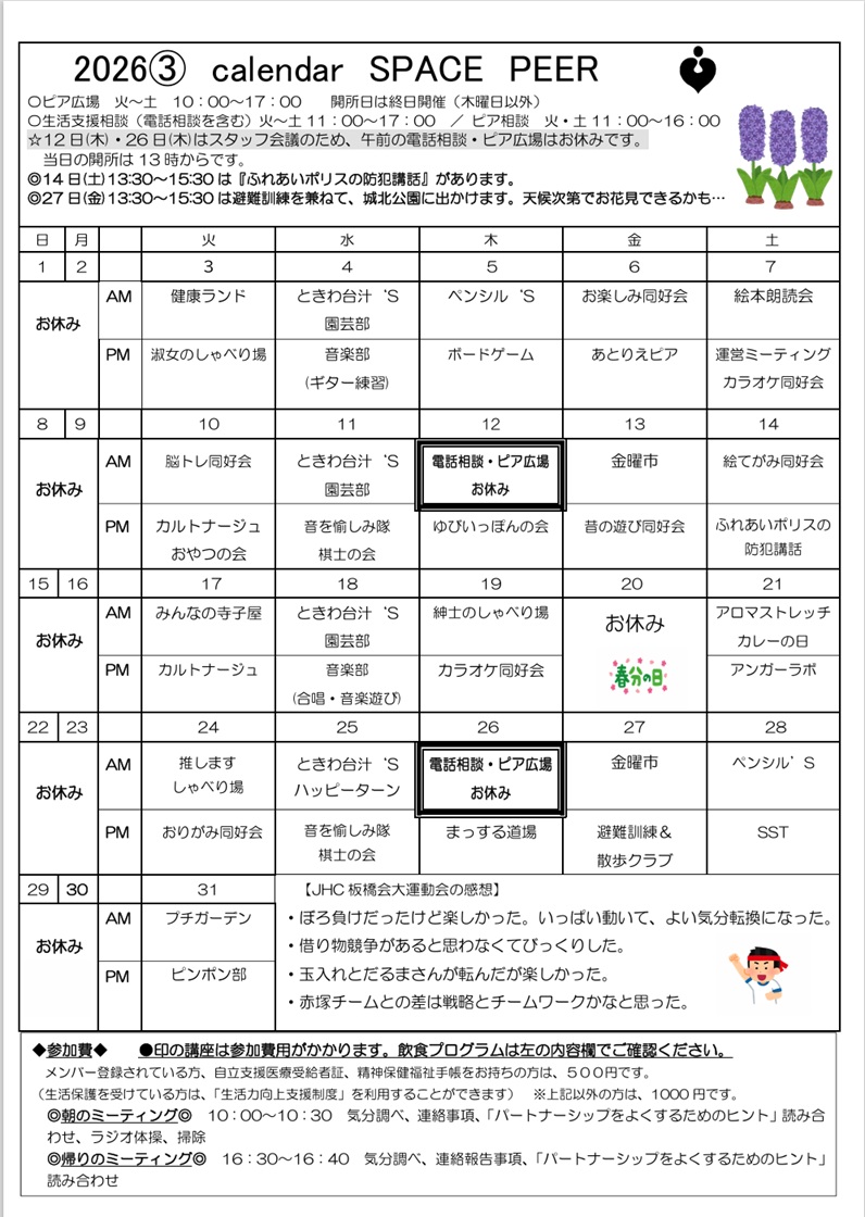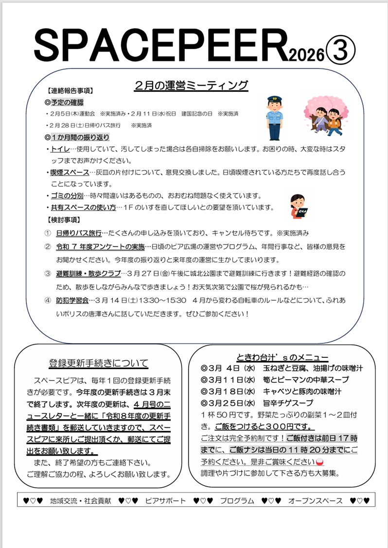 3月はふれあいポリスの防犯講話がございます。4月に新しくなる自転車のルールについて学べる貴重な機会です。また、下旬には避難経路の確認もかねて城北公園にお花見散歩に出かけます。たくさんのご参加お待ちしています。