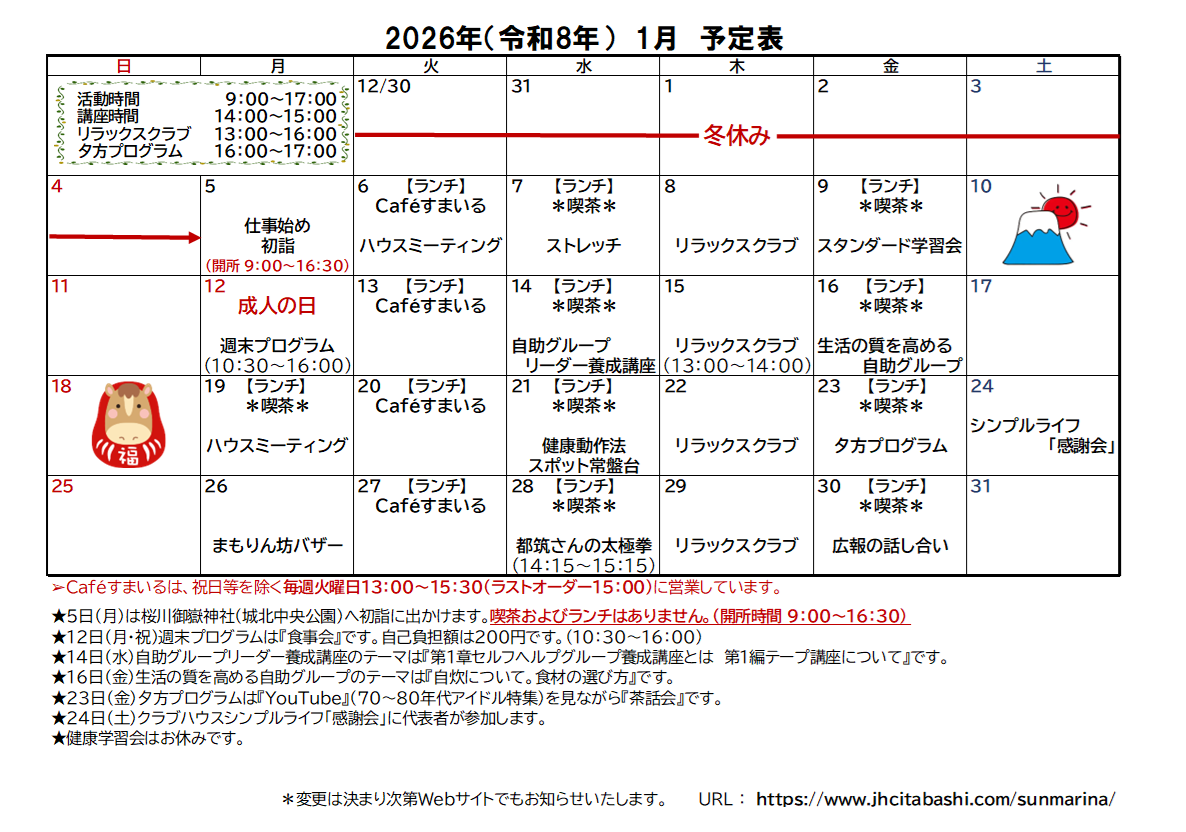 ・1月12日(月・祝)に週末プログラムとして『食事会』を10:30~16:00に行います。自己負担額は200円です。