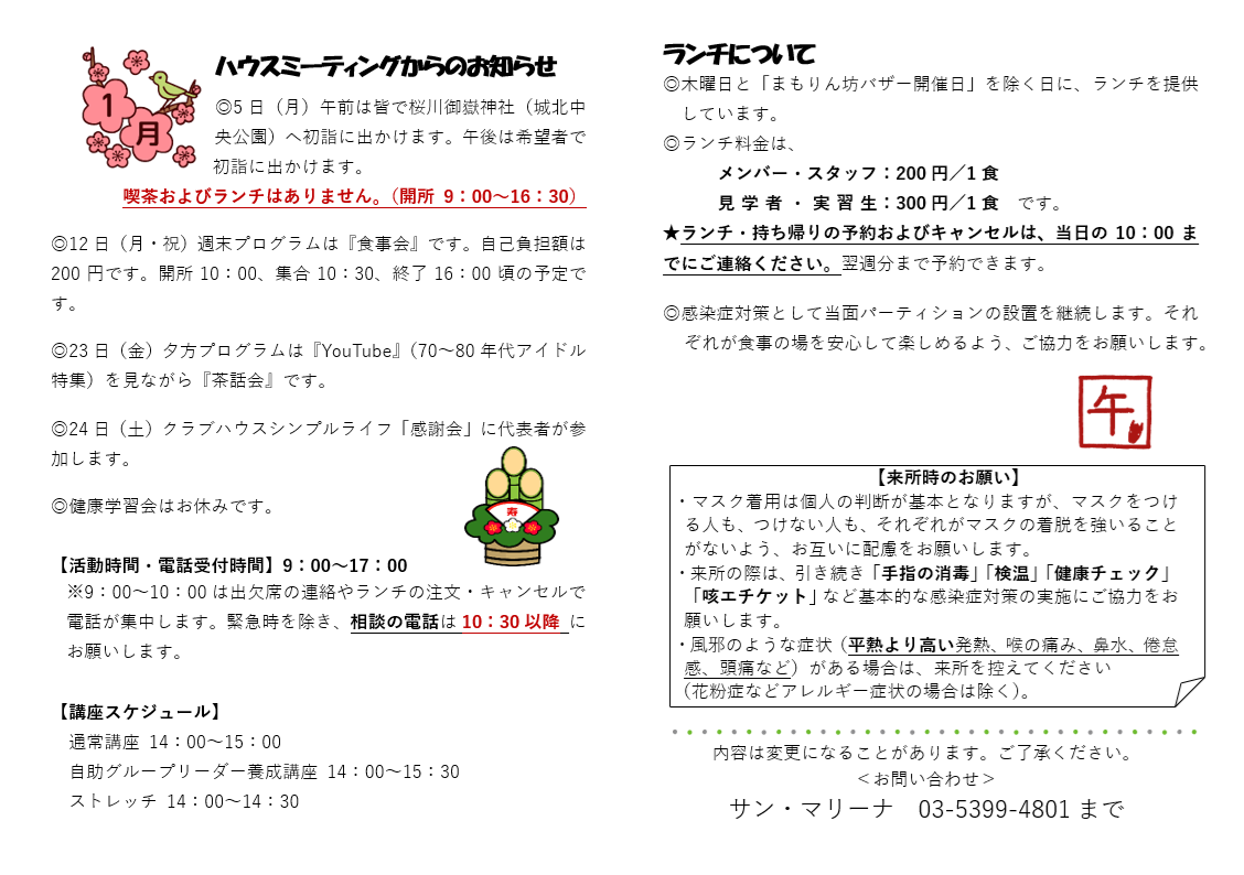 ・1月5日(月)は開所時間を9:00~16:30といつもより短くして、午前と午後それぞれ有志で桜川御嶽神社(城北中央公園)へ初詣に参ります。また、この日はランチ・喫茶ともにありませんのでご注意ください。